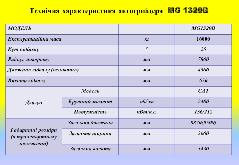 Слайд 5Технічна характеристика автогрейдера MG 1320B