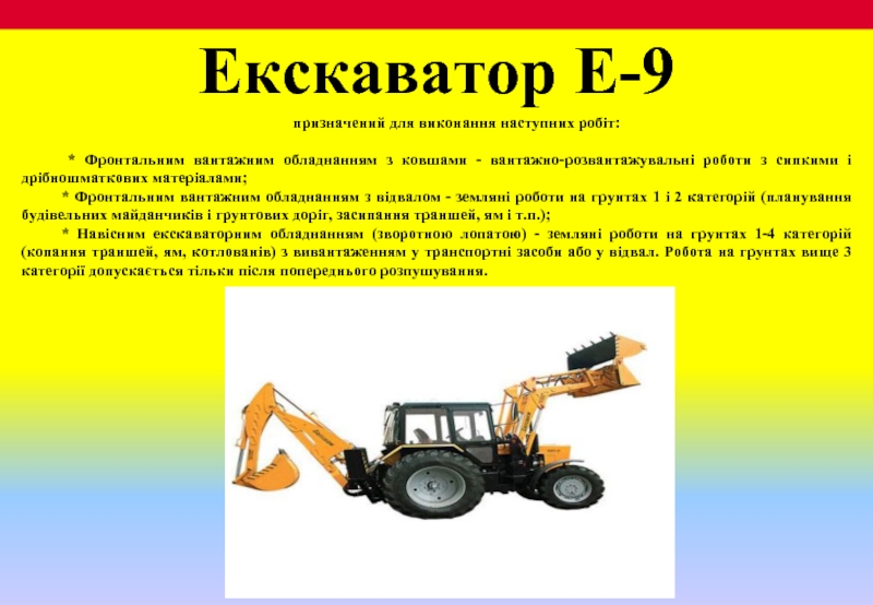 категорій, навантаження і розвантаження сипучих матеріалів, розпушених скельних порід і мерзлих ґрунтів (при величині кусків не більше 200 мм.), а також для інших робіт в умовах промислового, міського сільського, транспортного та меліоративного будівництва.