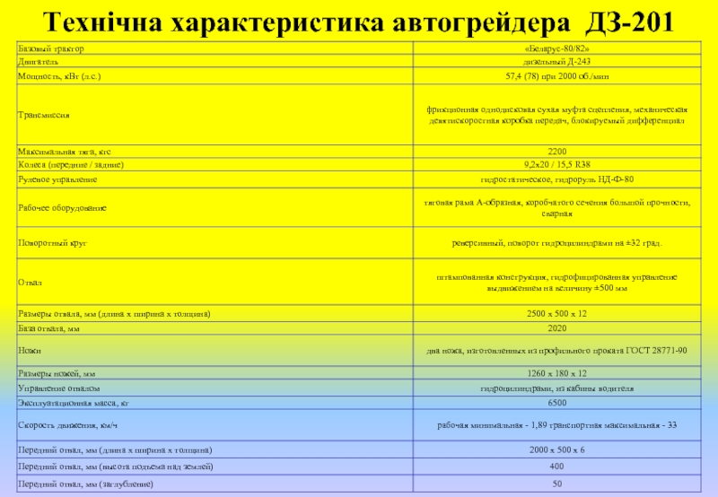 Слайд 15Технічна характеристика автогрейдера ДЗ-201