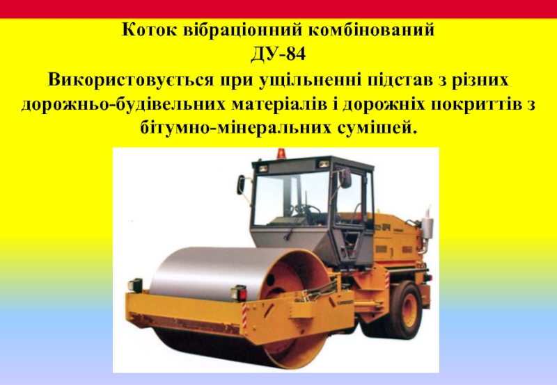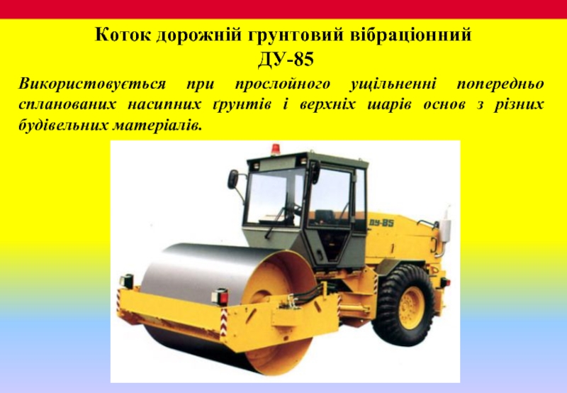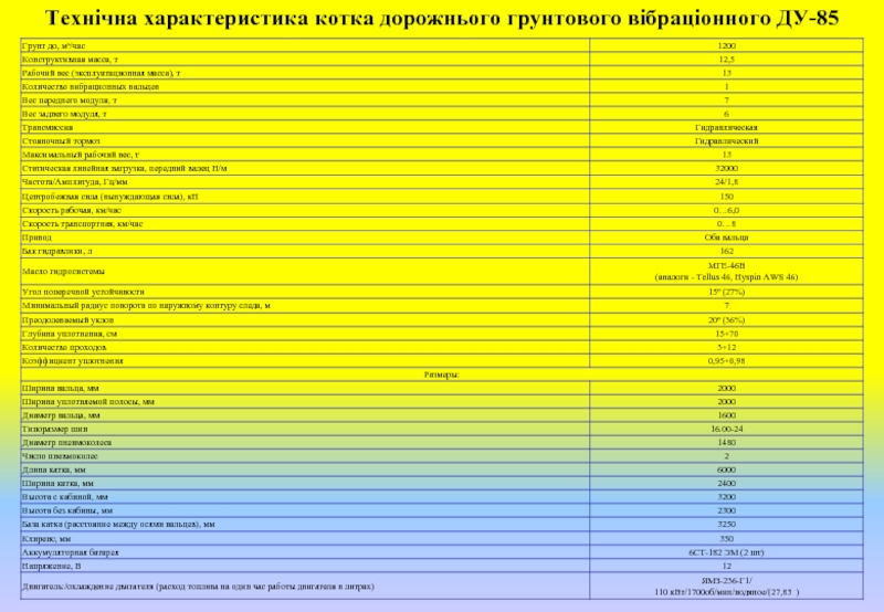 Слайд 26Технічна характеристика котка дорожнього грунтового вібраціонного ДУ-85
