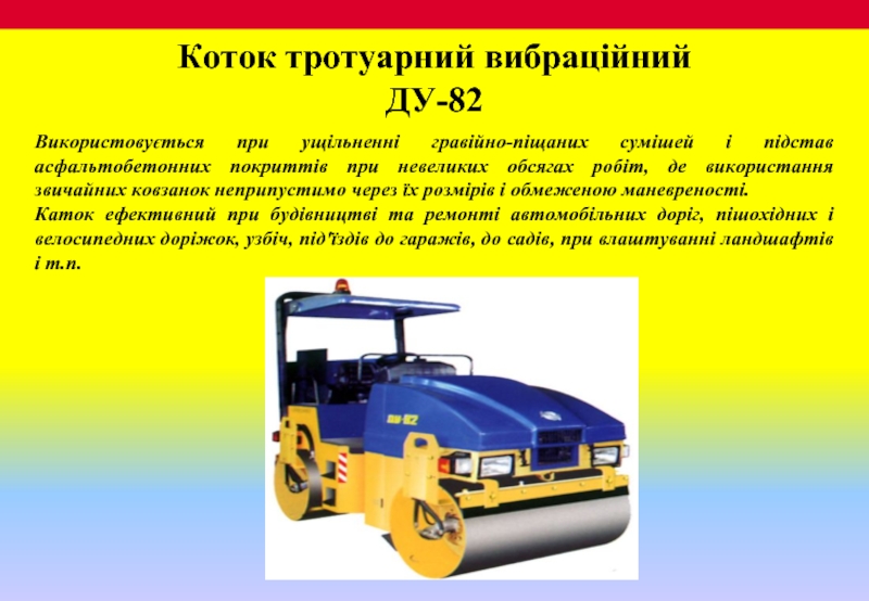 Каток ефективний при будівництві та ремонті автомобільних доріг, пішохідних і велосипедних доріжок, узбіч, під'їздів до гаражів, до садів, при влаштуванні ландшафтів і т.п.