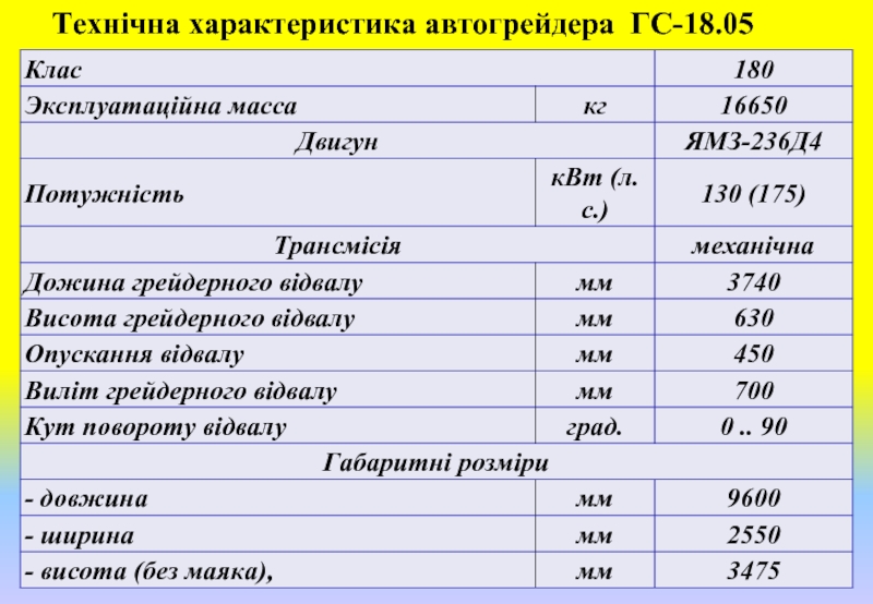 Слайд 11Технічна характеристика автогрейдера ГС-18.05