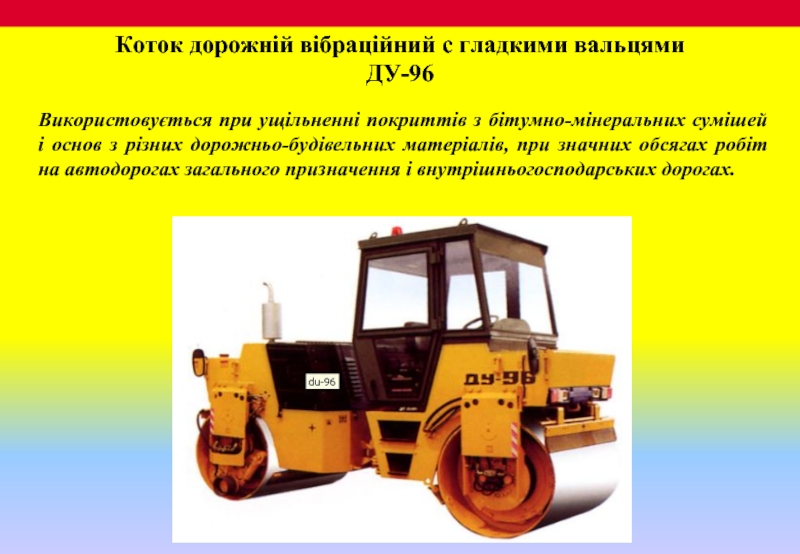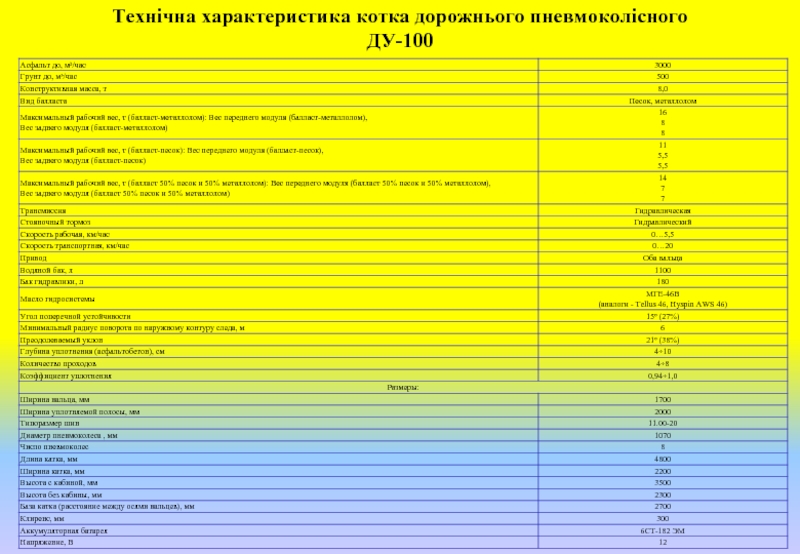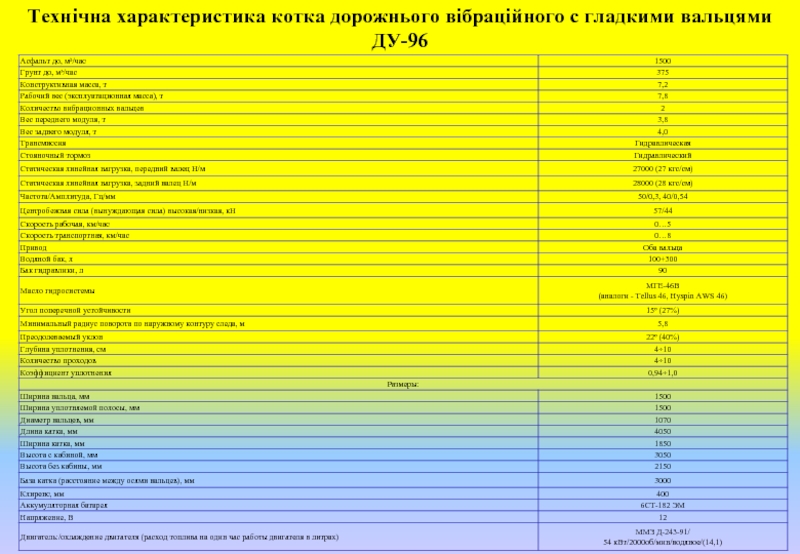 Слайд 30Технічна характеристика котка дорожнього вібраційного с гладкими вальцями ДУ-96