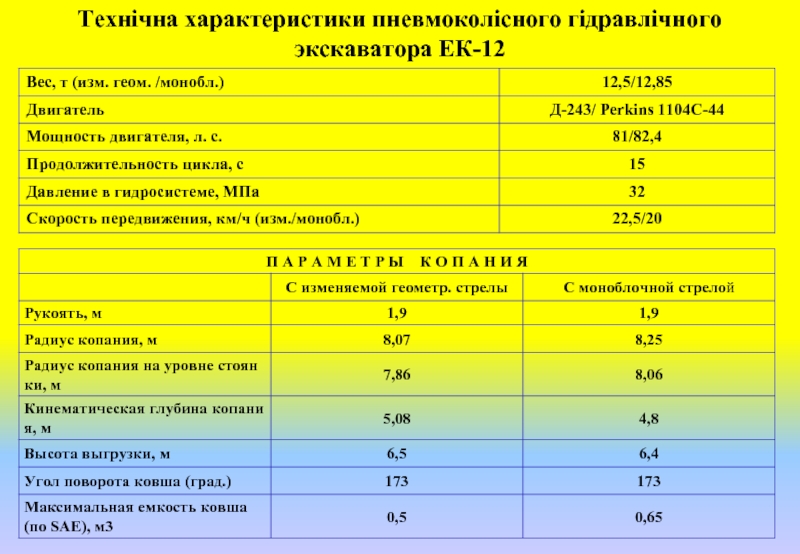 Слайд 54Технічна характеристики пневмоколісного гідравлічного экскаватора ЕК-12