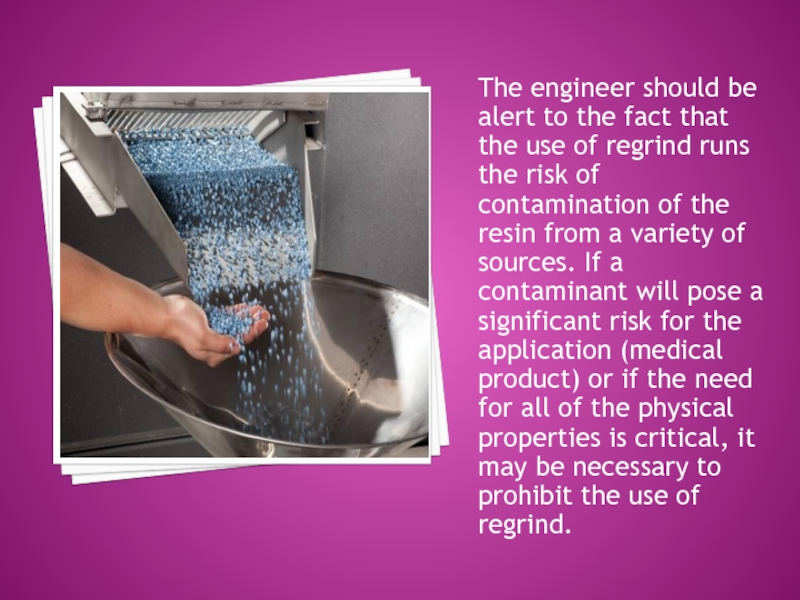 29) The engineer should be alert to the fact that the use of regrind runs the risk of contamination of the resin from a variety of sources. If a contaminant will pose a significant risk for the application (medical product) or if the need for all of the physical properties is critical, it may be necessary to prohibit the use of regrind.