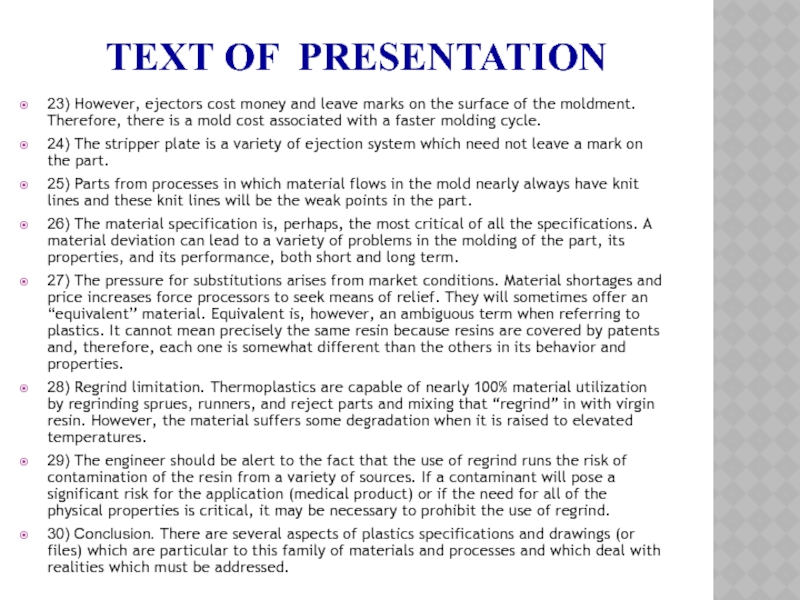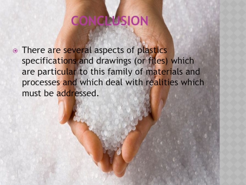 30) Conclusion. There are several aspects of plastics specifications and drawings (or files) which are particular to this family of materials and processes and which deal with realities which must be addressed.