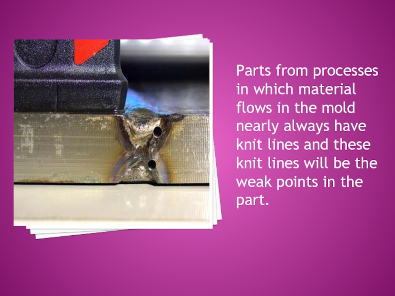 25) Parts from processes in which material flows in the mold nearly always have knit lines and these knit lines will be the weak points in the part.