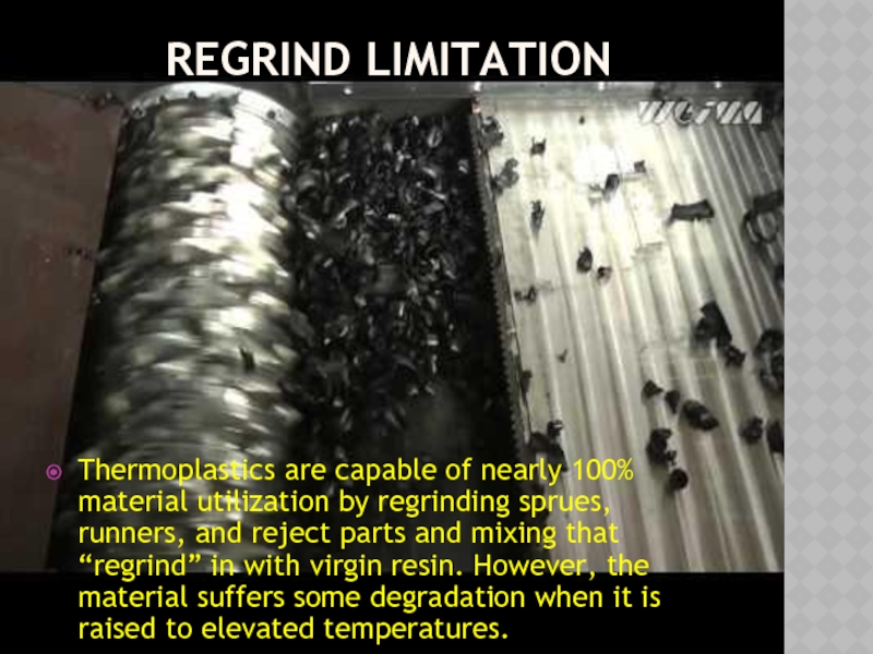 28) Regrind limitation. Thermoplastics are capable of nearly 100% material utilization by regrinding sprues, runners, and reject parts and mixing that “regrind” in with virgin resin. However, the material suffers some degradation when it is raised to elevated temperatures.