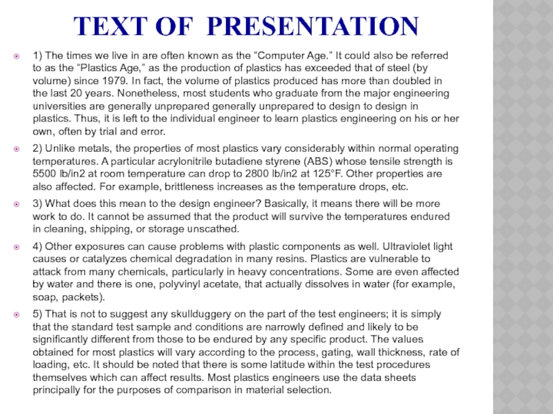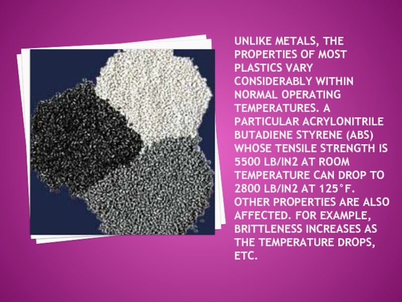 Слайд 3UNLIKE METALS, THE PROPERTIES OF MOST PLASTICS VARY CONSIDERABLY WITHIN NORMAL