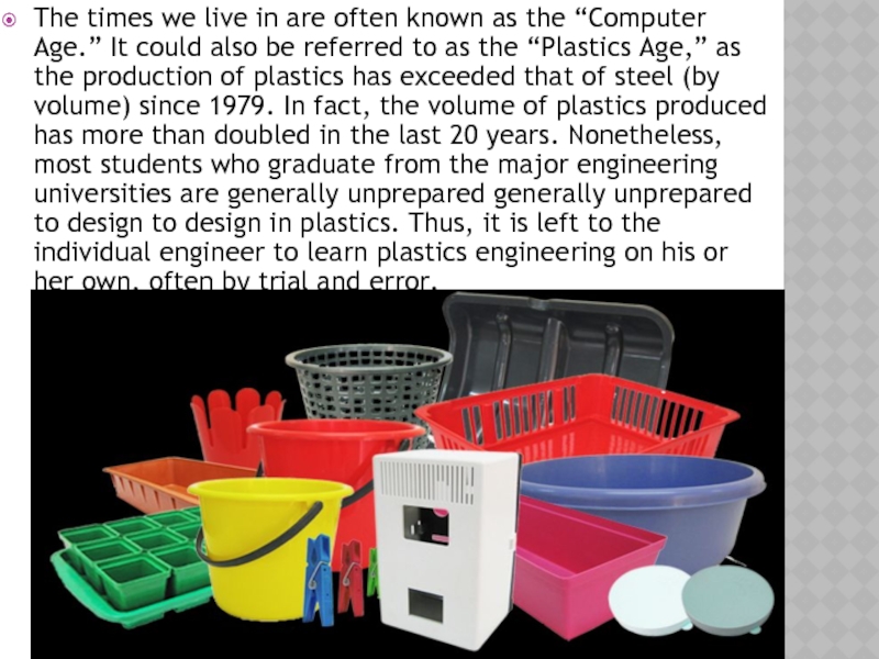 as the “Computer Age.” It could also be referred to as the “Plastics Age,” as the production of plastics has exceeded that of steel (by volume) since 1979. In fact, the volume of plastics produced has more than doubled in the last 20 years. Nonetheless, most students who graduate from the major engineering universities are generally unprepared generally unprepared to design to design in plastics. Thus, it is left to the individual engineer to learn plastics engineering on his or her own, often by trial and error.