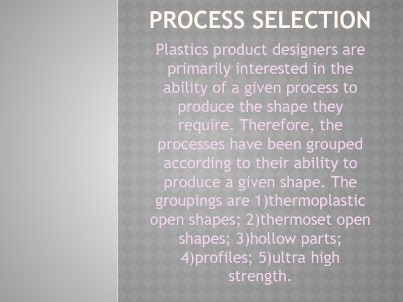 10) Process selection. Plastics product designers are primarily interested in the ability of a given process to produce the shape they require. Therefore, the processes have been grouped according to their ability to produce a given shape. The groupings are 1)thermoplastic open shapes; 2)thermoset open shapes; 3)hollow parts; 4)profiles; 5)ultra high strength.