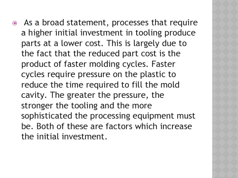 12) As a broad statement, processes that require a higher initial investment in tooling produce parts at a lower cost. This is largely due to the fact that the reduced part cost is the product of faster molding cycles. Faster cycles require pressure on the plastic to reduce the time required to fill the mold cavity. The greater the pressure, the stronger the tooling and the more sophisticated the processing equipment must be. Both of these are factors which increase the initial investment.