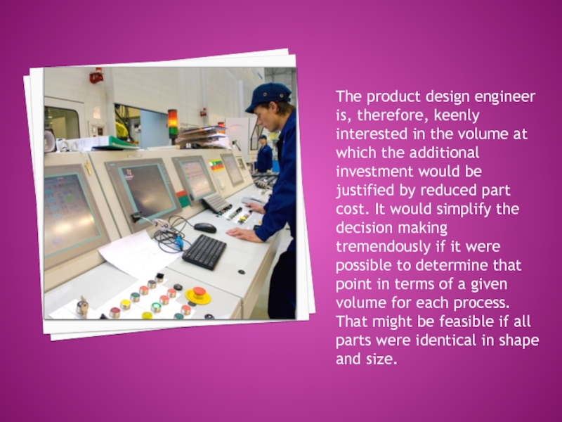 13) The product design engineer is, therefore, keenly interested in the volume at which the additional investment would be justified by reduced part cost. It would simplify the decision making tremendously if it were possible to determine that point in terms of a given volume for each process. That might be feasible if all parts were identical in shape and size.