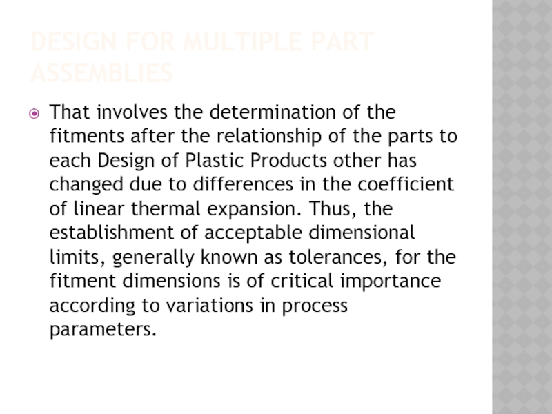 the relationship of the parts to each Design of Plastic Products other has changed due to differences in the coefficient of linear thermal expansion. Thus, the establishment of acceptable dimensional limits, generally known as tolerances, for the fitment dimensions is of critical importance according to variations in process parameters.