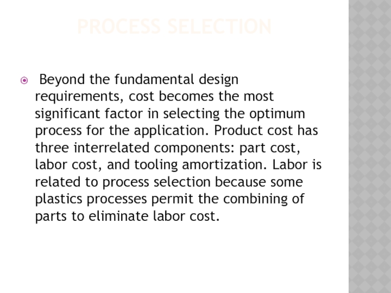 most significant factor in selecting the optimum process for the application. Product cost has three interrelated components: part cost, labor cost, and tooling amortization. Labor is related to process selection because some plastics processes permit the combining of parts to eliminate labor cost.