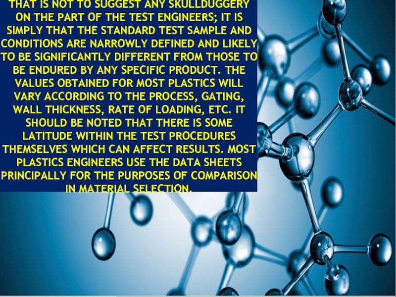 THE TEST ENGINEERS; IT IS SIMPLY THAT THE STANDARD TEST SAMPLE AND CONDITIONS ARE NARROWLY DEFINED AND LIKELY TO BE SIGNIFICANTLY DIFFERENT FROM THOSE TO BE ENDURED BY ANY SPECIFIC PRODUCT. THE VALUES OBTAINED FOR MOST PLASTICS WILL VARY ACCORDING TO THE PROCESS, GATING, WALL THICKNESS, RATE OF LOADING, ETC. IT SHOULD BE NOTED THAT THERE IS SOME LATITUDE WITHIN THE TEST PROCEDURES THEMSELVES WHICH CAN AFFECT RESULTS. MOST PLASTICS ENGINEERS USE THE DATA SHEETS PRINCIPALLY FOR THE PURPOSES OF COMPARISON IN MATERIAL SELECTION.