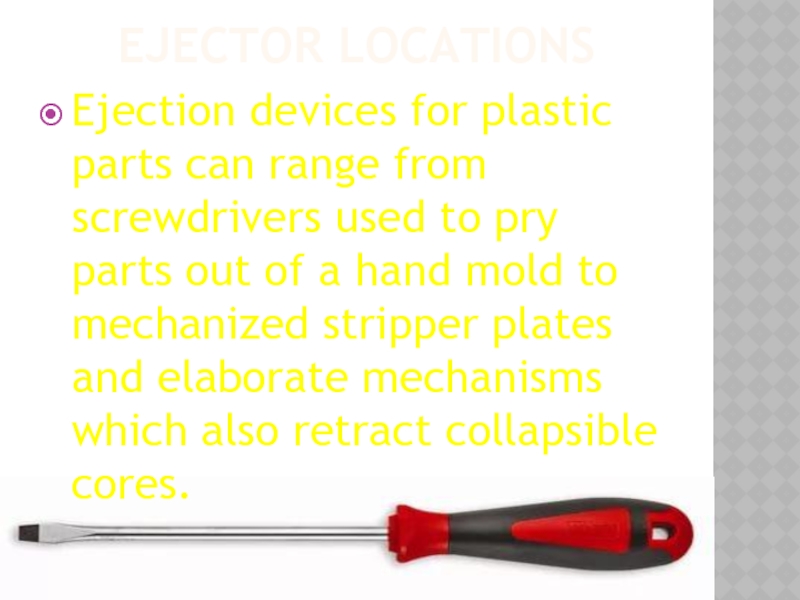 22) Ejector locations. Ejection devices for plastic parts can range from screwdrivers used to pry parts out of a hand mold to mechanized stripper plates and elaborate mechanisms which also retract collapsible cores.