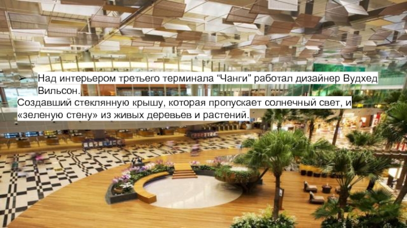 Слайд 18Над интерьером третьего терминала “Чанги” работал дизайнер Вудхед Вильсон.