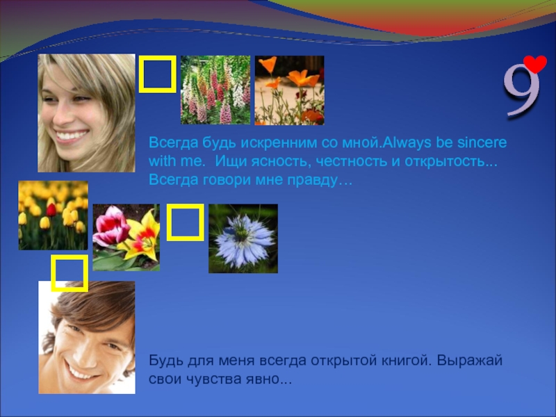 У нас должны быть нормальные и здоровые сексуальные взаимоотношения, в которых мы защитим наше достоинство не унижая друг друга...  Ты должен уважать моё тело.. Я восполню твои эмоциональные потребности и ты сделаешь тоже самое для меня..