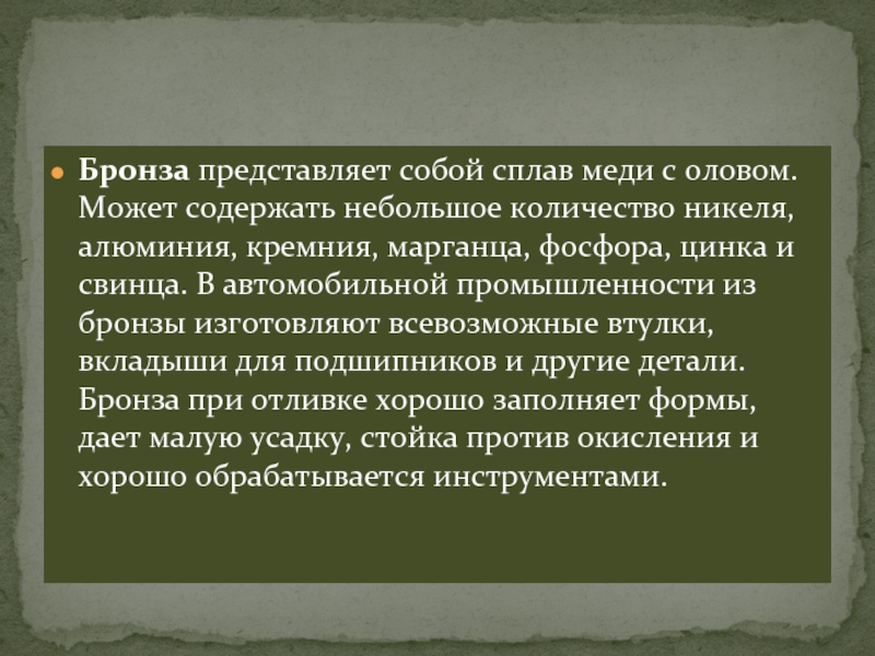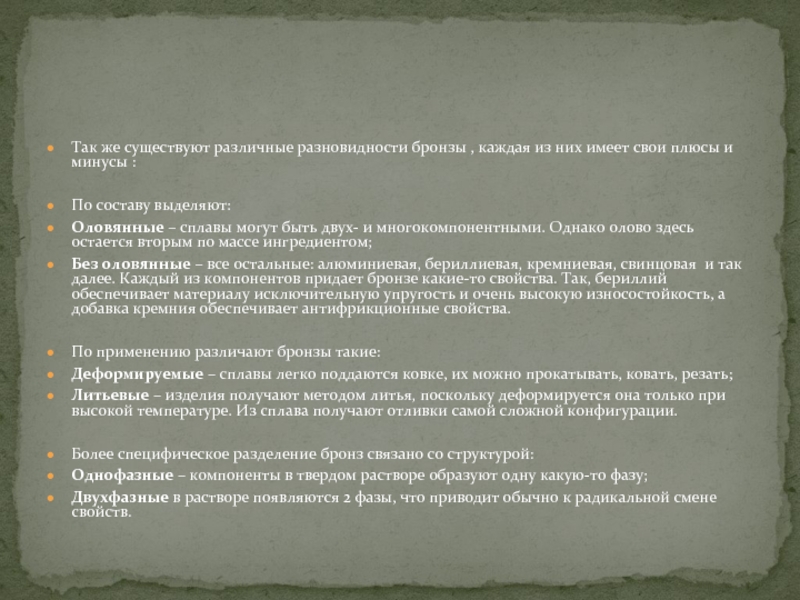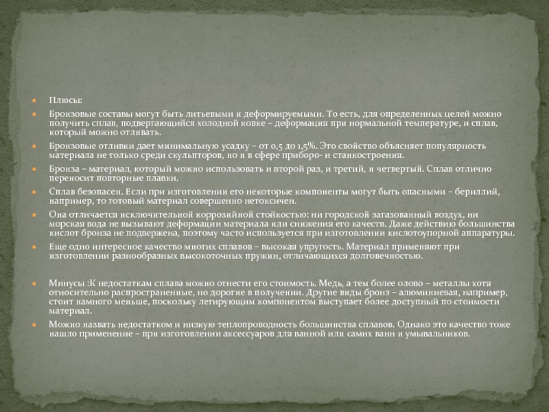 Минусы :К недостаткам сплава можно отнести его стоимость. Медь, а тем более олово – металлы хотя относительно распространенные, но дорогие в получении. Другие виды бронз – алюминиевая, например, стоит намного меньше, поскольку легирующим компонентом выступает более доступный по стоимости материал.