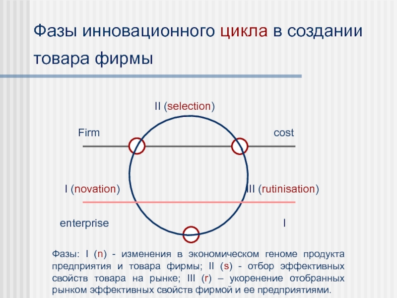 I (n) - изменения в экономическом геноме продукта предприятия и товара фирмы; II (s) - отбор эффективных свойств товара на рынке; III (r) – укоренение отобранных рынком эффективных свойств фирмой и ее предприятиями.