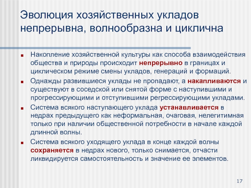 Слайд 17Эволюция хозяйственных укладов непрерывна, волнообразна и циклична