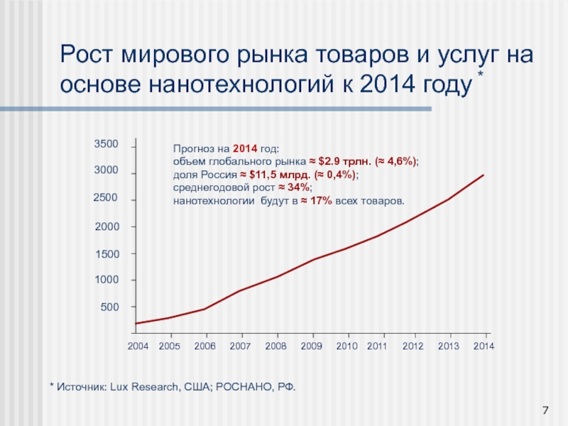 Слайд 7Рост мирового рынка товаров и услуг на основе нанотехнологий к 2014