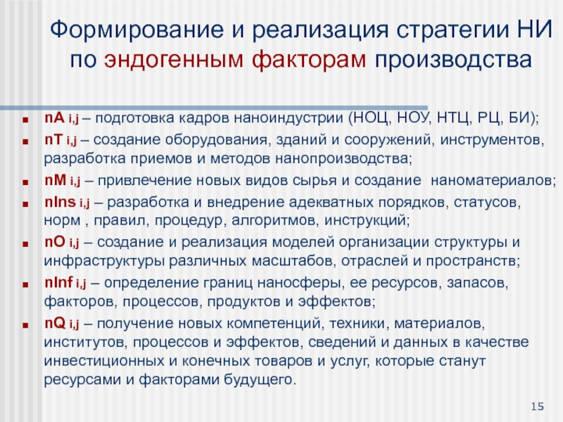 Слайд 15Формирование и реализация стратегии НИ по эндогенным факторам производства