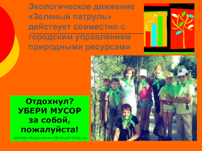 Слайд 6Экологическое движение «Зеленый патруль» действует совместно с городским управлением природными ресурсами