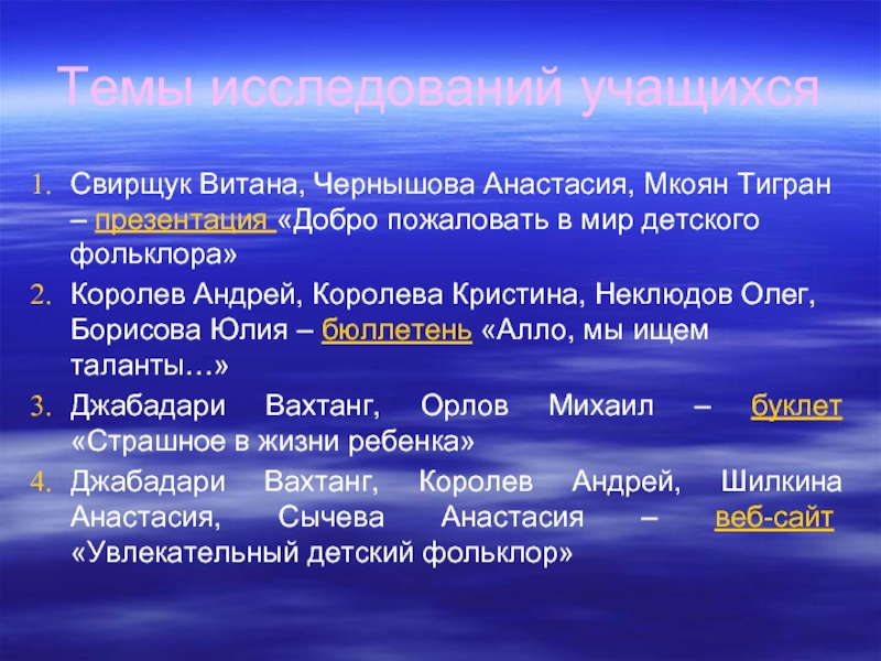 5 – 12 урок - выявление жанровой специфики детского фольклора, разбор отдельных жанров, подготовка учащихся к выполнению публикаций и веб-сайта.