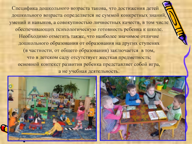 суммой конкретных знаний, умений и навыков, а совокупностью личностных качеств, в том числе обеспечивающих психологическую готовность ребенка к школе. Необходимо отметить также, что наиболее значимое отличие дошкольного образования от образования на других ступенях (в частности, от общего образования) заключается в том, что в детском саду отсутствует жесткая предметность; основной контекст развития ребенка представляет собой игра, а не учебная деятельность.