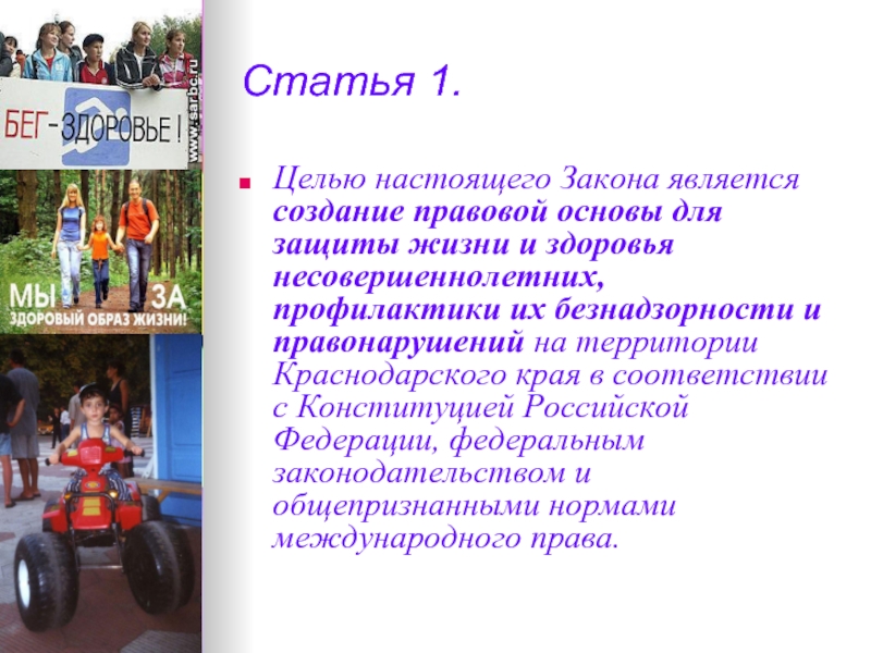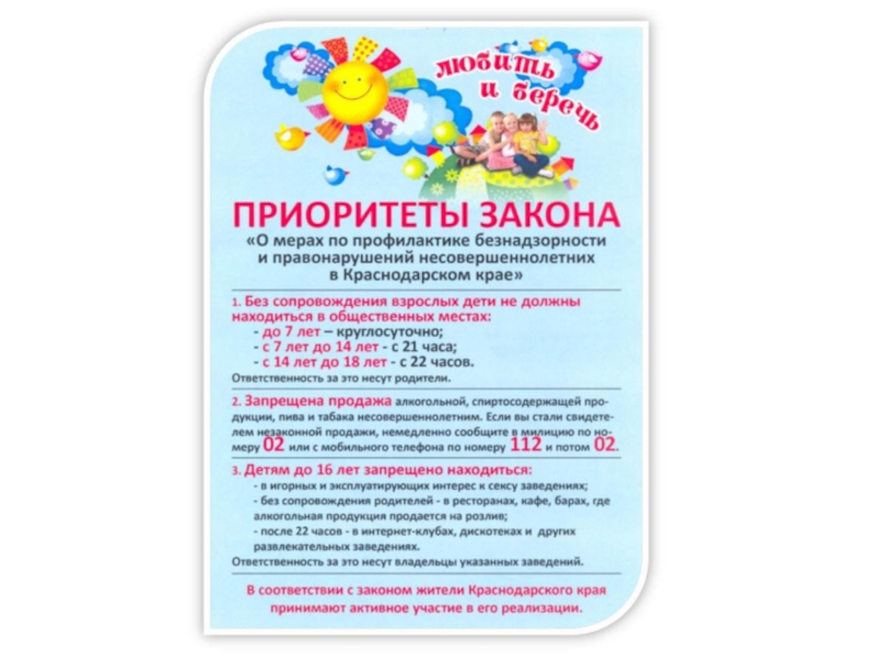 и здоровья несовершеннолетних, профилактики их безнадзорности и правонарушений на территории Краснодарского края в соответствии с Конституцией Российской Федерации, федеральным законодательством и общепризнанными нормами международного права.