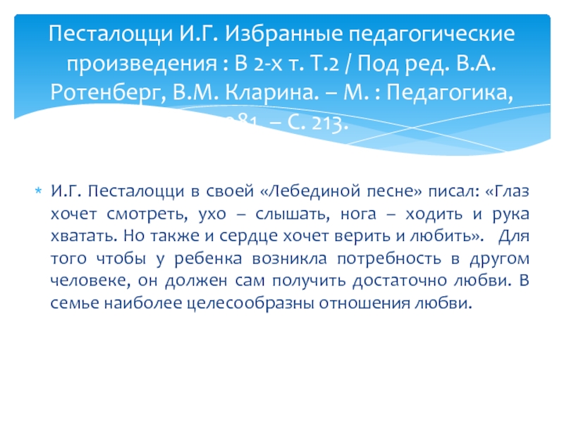 Песталоцци И.Г. Избранные педагогические произведения : В 2-х т. Т.2 / Под ред. В.А.Ротенберг, В.М. Кларина. – М. : Педагогика, 1981. – С. 213.
