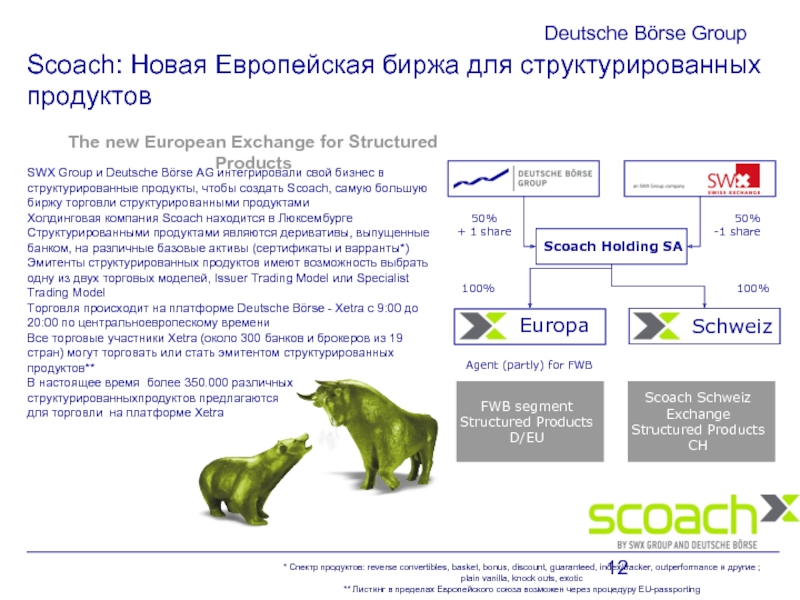 SWX Group и Deutsche Börse AG интегрировали свой бизнес в структурированные продукты, чтобы создать Scoach, самую большую биржу торговли структурированными продуктами