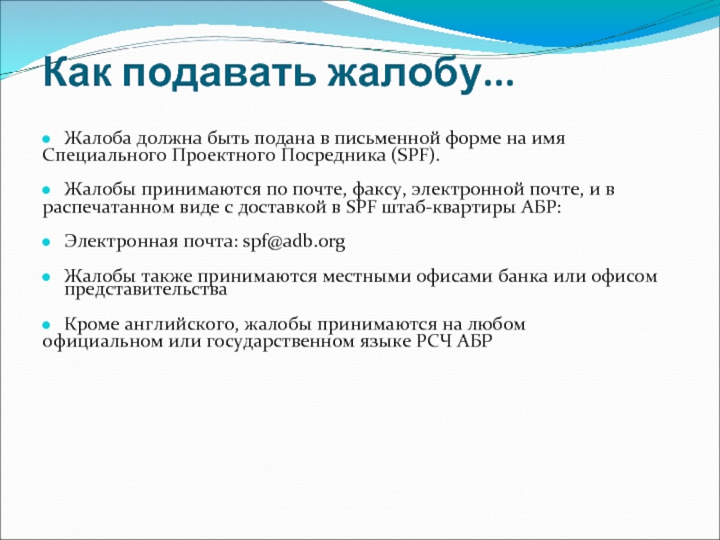 Жалобы также принимаются местными офисами банка или офисом представительства