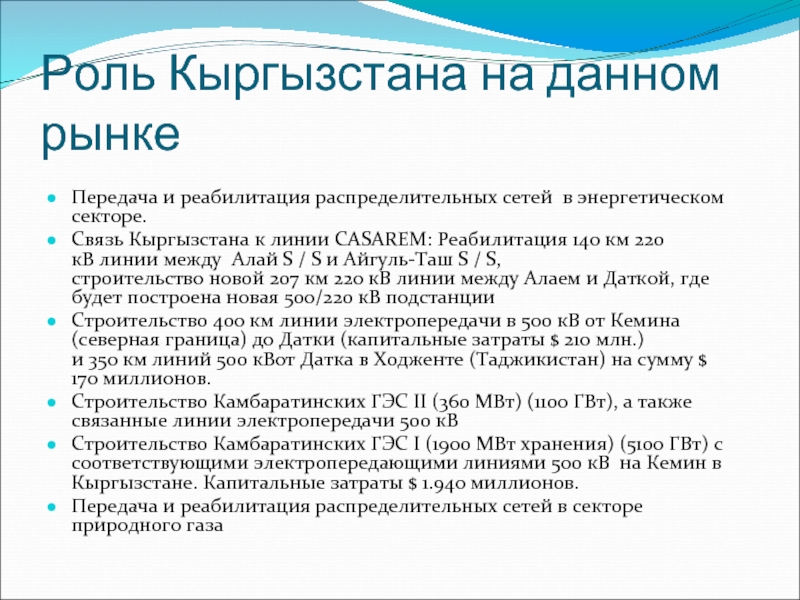 Строительство 400 км линии электропередачи в 500 кВ от Кемина (северная граница) до Датки (капитальные затраты $ 210 млн.) и 350 км линий 500 кВот Датка в Ходженте (Таджикистан) на сумму $ 170 миллионов.