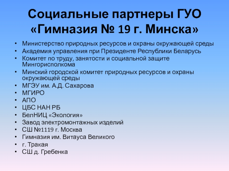 Слайд 4Социальные партнеры ГУО «Гимназия № 19 г. Минска»
