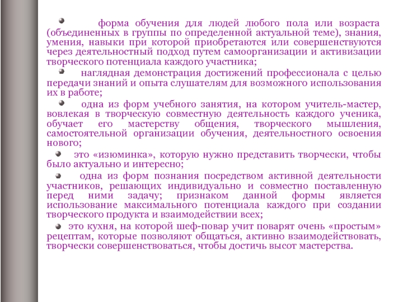 обучения для людей любого пола или возраста (объединенных в группы по определенной актуальной теме), знания, умения, навыки при которой приобретаются или совершенствуются через деятельностный подход путем самоорганизации и активизации творческого потенциала каждого участника;