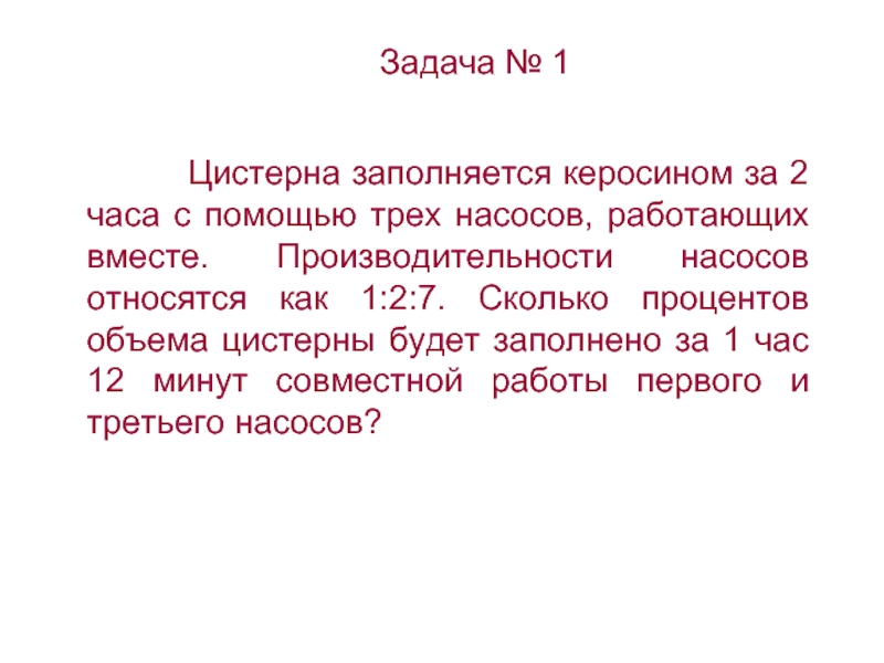 Цистерна заполняется керосином за 2 часа с помощью трех насосов, работающих вместе. Производительности насосов относятся как 1:2:7. Сколько процентов объема цистерны будет заполнено за 1 час 12 минут совместной работы первого и третьего насосов?