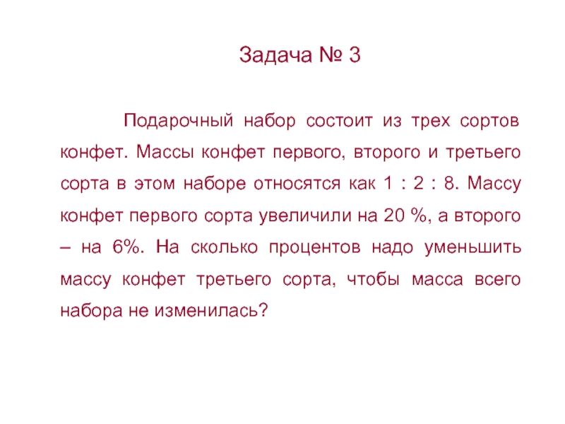 Подарочный набор состоит из трех сортов конфет. Массы конфет первого, второго и третьего сорта в этом наборе относятся как 1 : 2 : 8. Массу конфет первого сорта увеличили на 20 %, а второго – на 6%. На сколько процентов надо уменьшить массу конфет третьего сорта, чтобы масса всего набора не изменилась?
