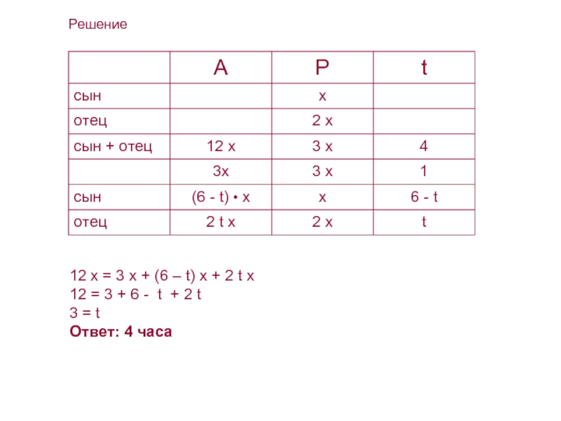 Отец с сыном должны вскопать огород. Производительность труда у отца в два раза больше, чем у сына. Работая вместе, они могут вскопать огород за 4 часа. Однако вместе они проработали только один час, потом некоторое время работал один сын, а заканчивал работу отец. Сколько часов в общей сложности проработал на огороде отец, если вся работа на огороде была выполнена за 7 часов?