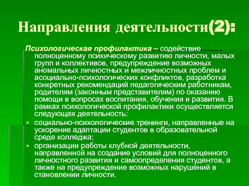 и коллективов, предупреждение возможных аномальных личностных и межличностных проблем и асоциально-психологических конфликтов, разработка конкретных рекомендаций педагогическим работникам, родителям (законным представителям) по оказанию помощи в вопросах воспитания, обучения и развития. В рамках психологической профилактики осуществляется следующая деятельность: