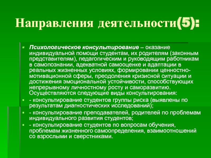 представителям), педагогическим и руководящим работникам в самопознании, адекватной самооценке и адаптации в реальных жизненных условиях, формировании ценностно-мотивационной сферы, преодоления кризисной ситуации и достижения эмоциональной устойчивости, способствующих непрерывному личностному росту и саморазвитию. Осуществляются следующие виды консультирования: