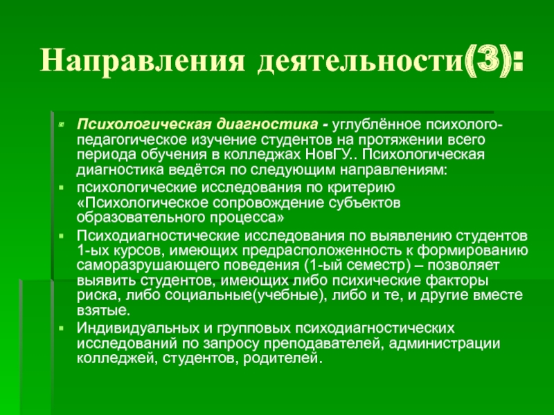периода обучения в колледжах НовГУ.. Психологическая диагностика ведётся по следующим направлениям: