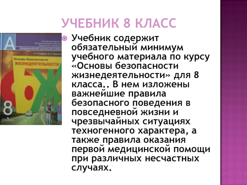 безопасности жизнедеятельности» для 8 класса.. В нем изложены важнейшие правила безопасного поведения в повседневной жизни и чрезвычайных ситуациях техногенного характера, а также правила оказания первой медицинской помощи при различных несчастных случаях.