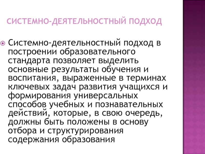 Системно-деятельностный подход в построении образовательного стандарта позволяет выделить основные результаты