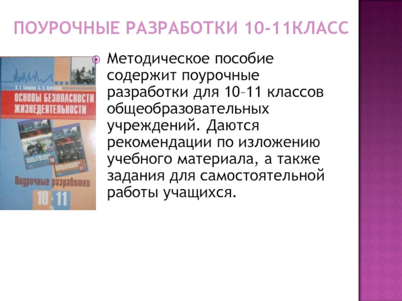 учреждений, работающих по учебникам Смирнова А.Т. Каждый урок определяет тему и цель, дает рекомендации по изложению учебного материала, а также предлагает вопросы для контроля знаний учащихся.
