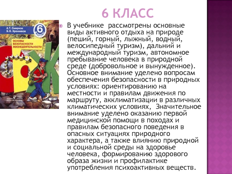 горный, лыжный, водный, велосипедный туризм), дальний и международный туризм, автономное пребывание человека в природной среде (добровольное и вынужденное). Основное внимание уделено вопросам обеспечения безопасности в природных условиях: ориентированию на местности и правилам движения по маршруту, акклиматизации в различных климатических условиях, Значительное внимание уделено оказанию первой медицинской помощи в походах и правилам безопасного поведения в опасных ситуациях природного характера, а также влиянию природной и социальной среды на здоровье человека, формированию здорового образа жизни и профилактике употребления психоактивных веществ.
