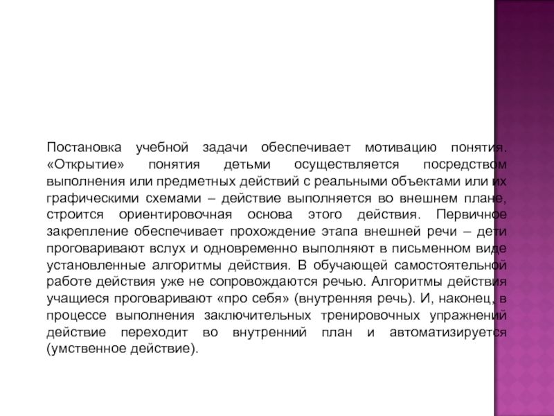 Слайд 8Постановка учебной задачи обеспечивает мотивацию понятия. «Открытие» понятия детьми осуществляется посредством
