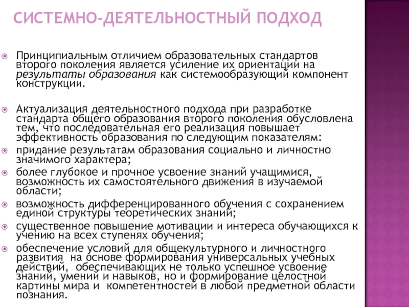 Актуализация деятельностного подхода при разработке стандарта общего образования второго поколения обусловлена тем, что последовательная его реализация повышает эффективность образования по следующим показателям: